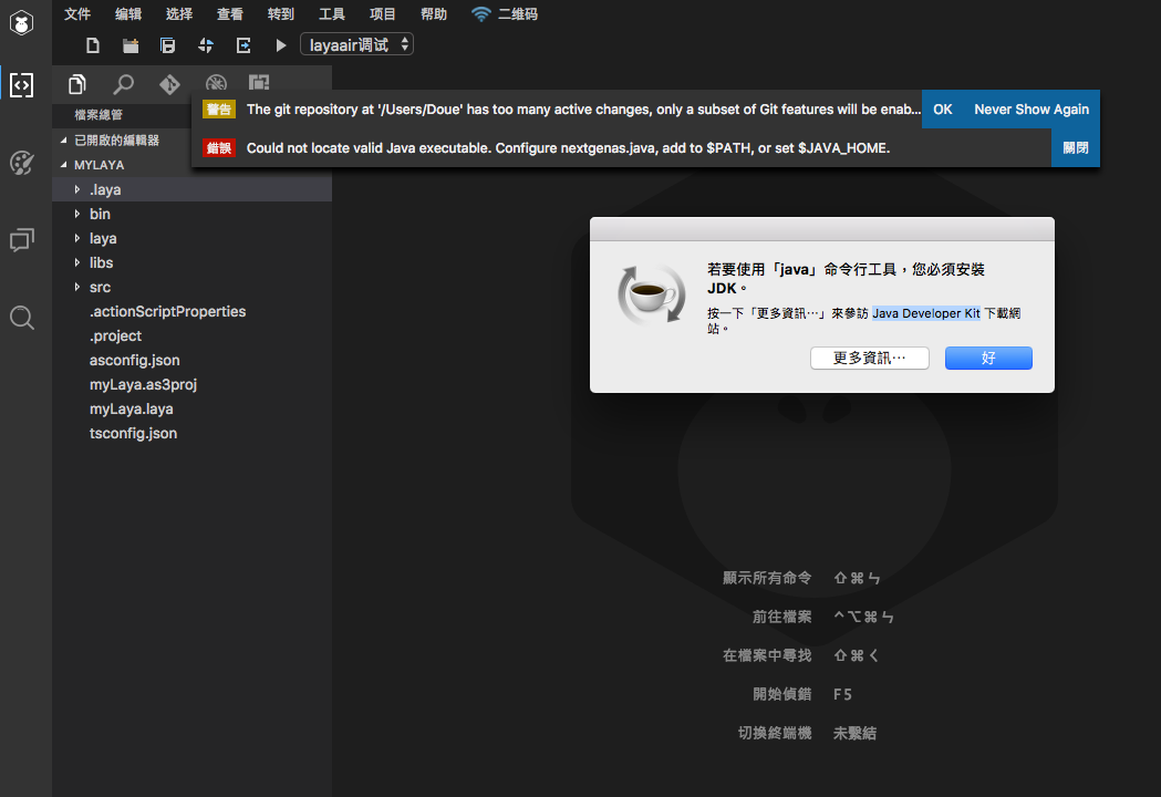 • LayaAir IDE檢查後,會提示是否需要安裝TypeScript編譯環境